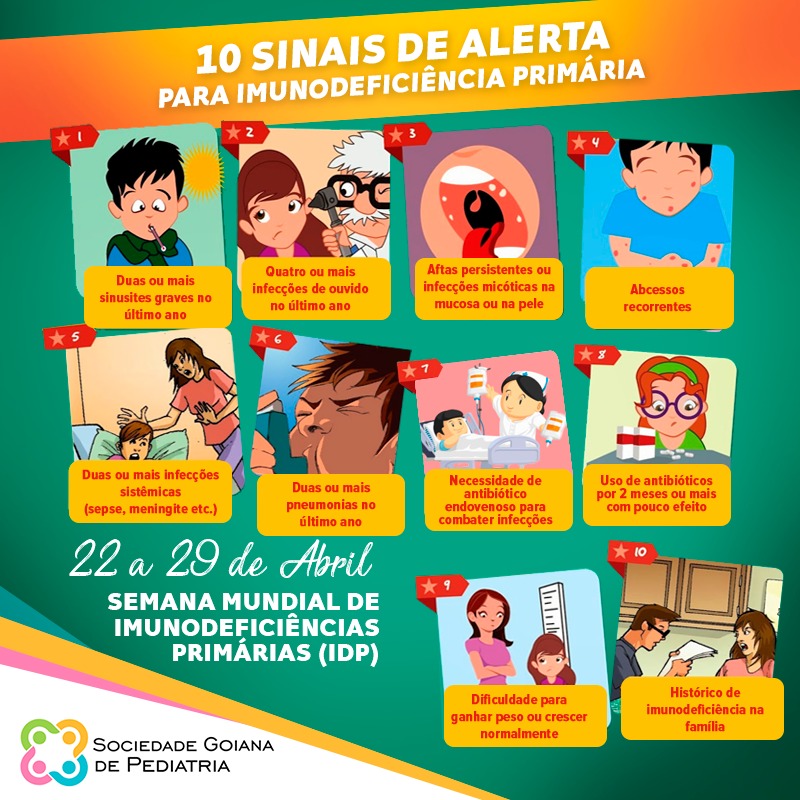 As Imunodeficiências Primárias são doenças genéticas raras que apresentam problemas nos componentes do sistema imunológico. Os sintomas mais comuns são as infecções, que se manifestam durante a infância e, quando não diagnosticadas e tratadas adequadamente no primeiro ano de vida, podem levar essas crianças à morte. Conheça alguns dos sinais, informe-se converse sempre com seu pediatra, pois só assim será possível salvar cada vez mais vidas!