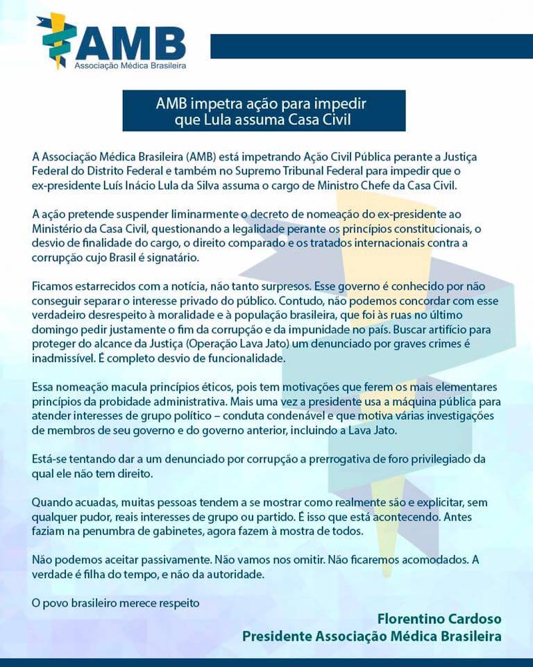 AMB impetra ação para impedir que Lula assuma Casa Civil
