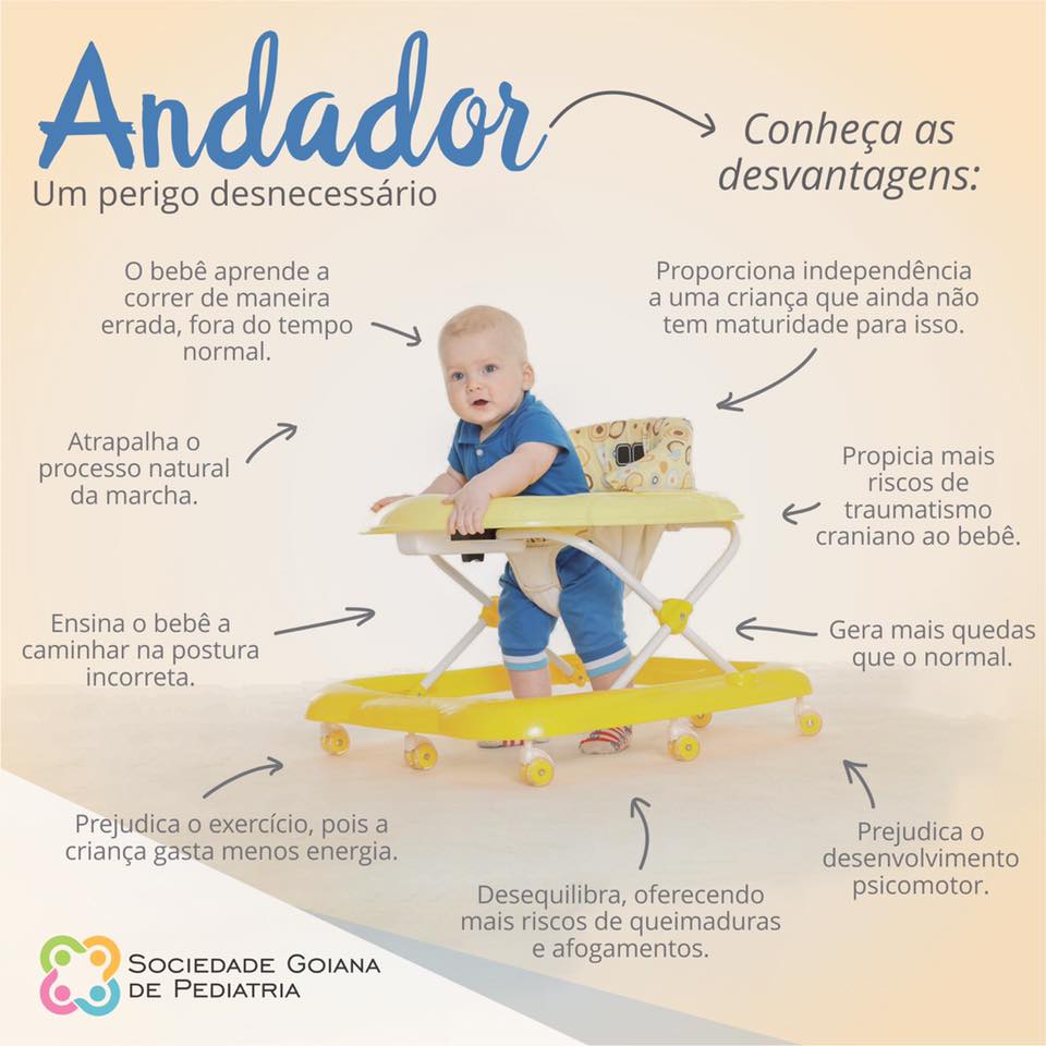 O uso de andadores infantis é condenado pelas Sociedades Brasileira e Goiana de Pediatria. Além de retirar estímulos importantes, como o equilíbrio, esses objetos atrasam o desenvolvimento dos bebês, que não estão com a musculatura preparada para ficar em pé, e ainda facilitam o contato com fogões, produtos inflamáveis e de limpeza, piscinas, escadas e outras situações de perigo à vida da criança.
