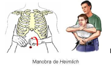 - Maiores de um ano: manobra de Heimlich, que consiste em compressões abaixo das costelas, com sentido para cima, abraçando a criança por trás, até que o CE seja deslocado da via aérea para a boca e expelido.