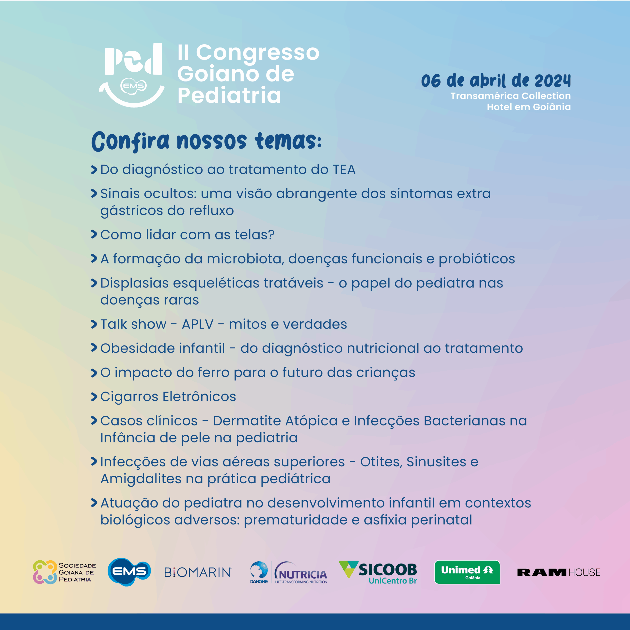 Outros temas direcionados ao cuidado com a criança e o adolescente também integram o evento promovido pela SGP, especialmente aqueles que acendem sinais claros de alerta, como o aumento da obesidade. Discussões relacionadas à abordagem terapêutica do TEA (Transtorno do Espectro Autista), infecções comuns na infância e a atuação do pediatra no desenvolvimento infantil também são temáticas que compõem as palestras e mesas redondas do evento que deve receber especialistas de diferentes regiões do Brasil.