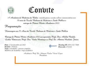 No dia 12 de dezembro, a Academia de Medicina da Bahia aos Professores Doutores Achilléa Cândido Lisbôa Bittencourt, Nubia Mendonça e Almério Machado Júnior o Prê- mio Mérito Acadêmico 2022.
