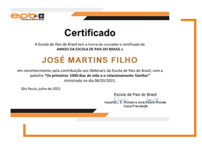 Recebeu o certificado de “Amigo da Escola de Pais do Brasil”, como reconhecimento pela contribuição aos webnars.