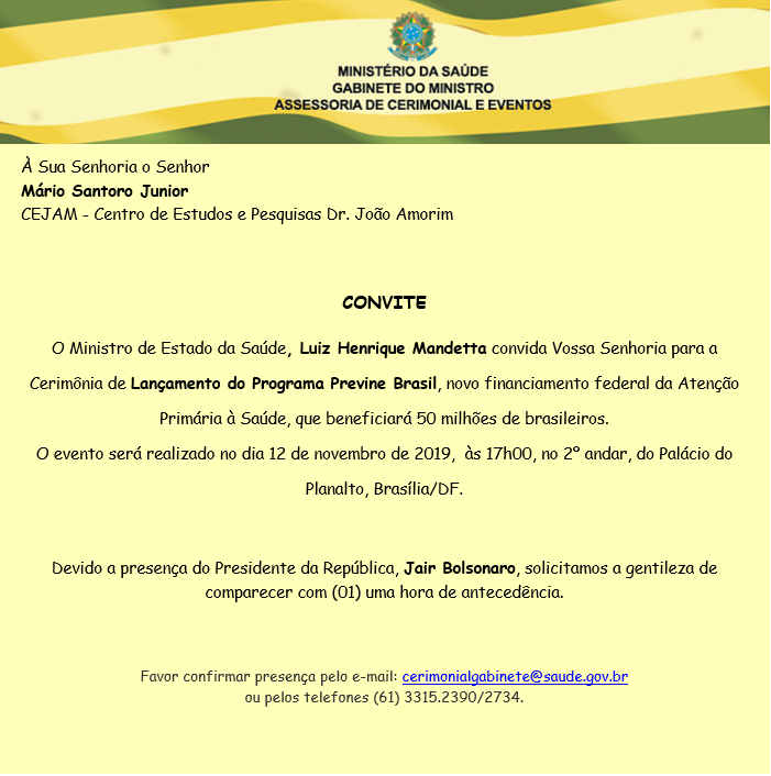 CONVITE – O Ministro de Estado da Saúde, LUIZ HENRIQUE MANDETTA, convida Dr. Mário Santoro Júnior, Presidente da Academia Brasileira de Pediatria para a Cerimônia de Lançamento do Programa Previne Brasil, dia 12 de novembro de 2019, No Palácio do Planalto, Brasília/DF.