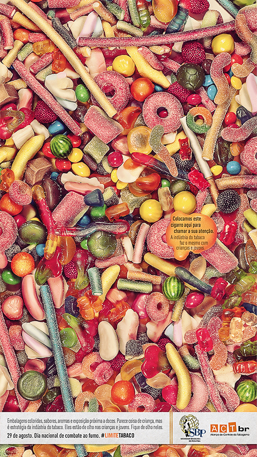 Neste 29 de agosto, Dia Nacional de Combate ao Fumo, a SBP se une à Aliança de Controle do Tabagismo (ACT) em um importante alerta: cigarros não podem ser misturados a balas e doces, vendidos juntos ou próximos, com sabores e embalagens atraentes! Assim como faz a peça publicitária acima, isso pode estimular o consumo, especialmente por adolescentes e jovens em geral. É urgente o fim da propaganda de cigarros em pontos de venda como padarias, bares, lanchonetes, bancas de jornal, supermercados, lojas de conveniência, e isso está previsto na lei 12.546, sancionada pela Presidente da República e que há 18 meses aguarda regulamentação! A mesma legislação proíbe o fumo em ambientes fechados em todo o País.