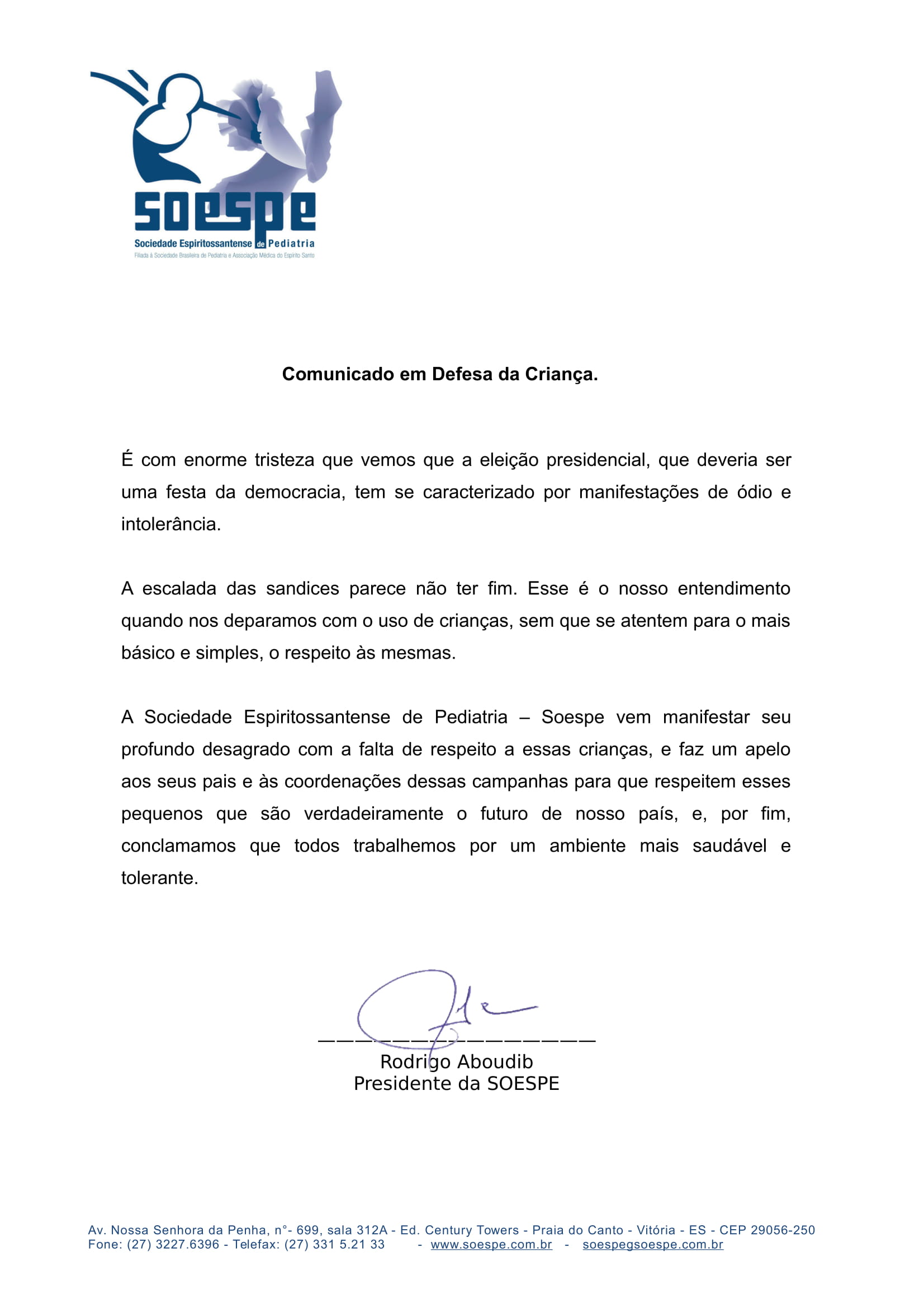 Comunicado da SOESPE sobre a utilização indevida de crianças em campanhas partidárias na eleição presidencial de 2018.