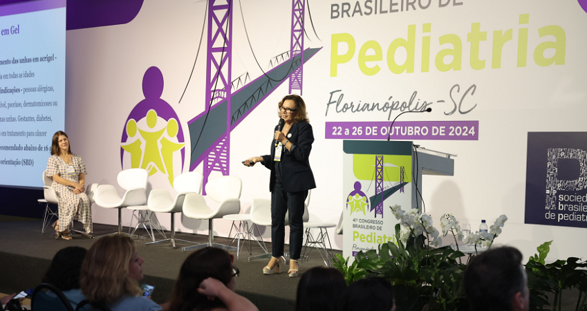 O uso precoce de cosméticos e o impacto das redes sociais na autoimagem e autoestima dos adolescentes foram abordados durante a miniconferência apresentada por Lígia Reato, especialista em medicina da adolescência, durante o 41º CBP. Para dimensionar o cenário, ela trouxe dados sobre o crescimento do mercado de cosméticos entre o público jovem, com movimentação global de US$ 1,8 bilhão, em 2021, e expectativa de alcançar US$ 2,9 bilhões, em 2027. A sessão foi coordenada por Maria Inês Costa Jonas, do Departamento Científico de Adolescência da SBP.