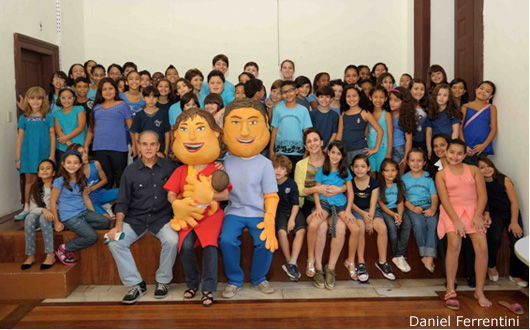 Crianças do coral e do teatro com o acadêmico Dias Rego e a diretora Marília Martins, na última Semana Mundial da Amamentação, no Rio de Janeiro
