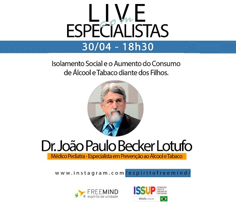 Na próxima quinta-feira (30), o especialista em álcool e outras drogas da Sociedade Brasileira de Pediatria (SBP), dr. João Paulo Becker Lotufo, ministrará live a respeito do isolamento social imposto pela atual pandemia de Covid-19 e o consequente aumento do consumo de álcool e tabaco diante de crianças e adolescentes. A apresentação será gratuita e transmitida por meio do perfil no Instagram do Freemind, instituto que atua para a prevenção do uso de drogas baseado em evidências científicas.