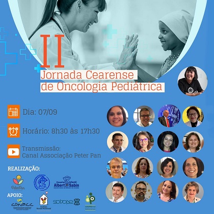 Atualizar os profissionais da saúde a respeito das doenças oncológicas. Esse é o intuito da II Jornada Cearense de Oncologia Pediátrica, promovida em parceria pela Sociedade Cearense de Pediatria (Socep), Associação Peter Pan e Hospital Infantil Albert Sabin. Em função da pandemia de Covid-19, nesta edição o evento acontece de forma virtual, no dia 7 de setembro, das 8h30 às 17h30, com transmissão por meio do canal da Associação Peter Pan no YouTube.