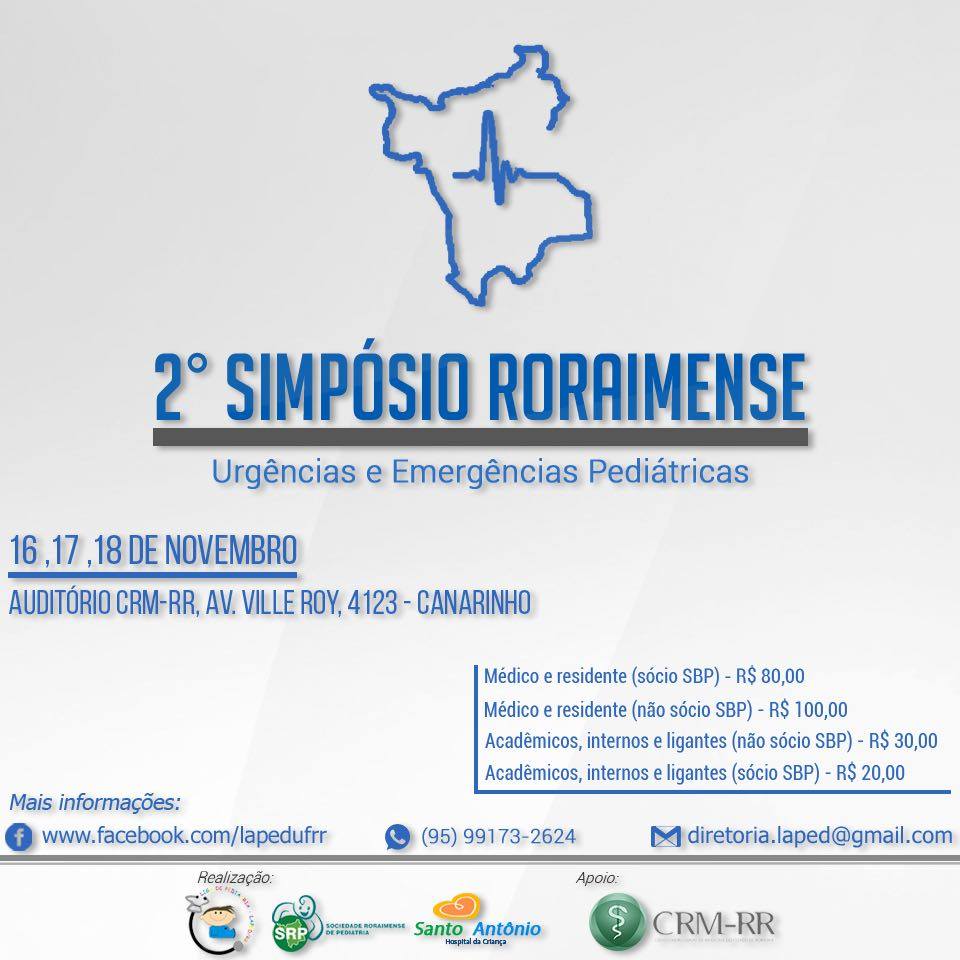 A Sociedade Roraimense de Pediatria (SRP), a Liga de Pediatria LAPED/UFRR e o Hospital da Criança Santo Antônio realizam nos dias 16, 17 e 18 de novembro o II Simpósio Roraimense de Urgência e Emergência Pediátrica.