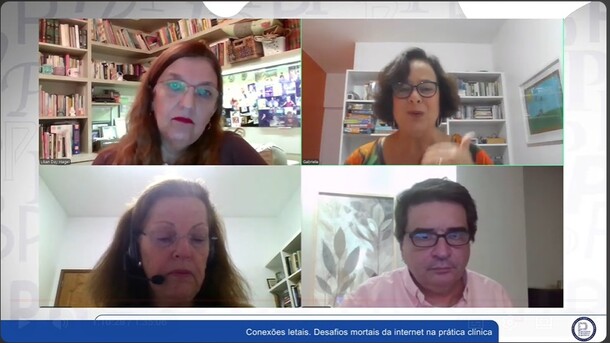 Após a exposição, foi promovido um debate com as dras. Evelyn Eisenstein – coordenadora do GT de Saúde Digital da Após a exposição, seguiu-se um debate com a dra. Evelyn Eisenstein, coordenadora do GT de Saúde Digital da SBP; dra. Gabriela Crenzel, membro do GT de Saúde Mental da SBP; e dra. Lilian Day Hagel, presidente do DC de Adolescência da SBP.