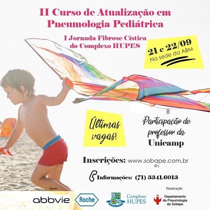 Seguem abertas, no site da Sociedade Baiana de Pediatria, as inscrições para o II Curso de Atualização em Pneumologia Pediátrica, que acontece nos dias 21 e 22 de setembro, em Salvador, na sede da Associação Bahiana de Medicina (ABM), no bairro de Ondina.