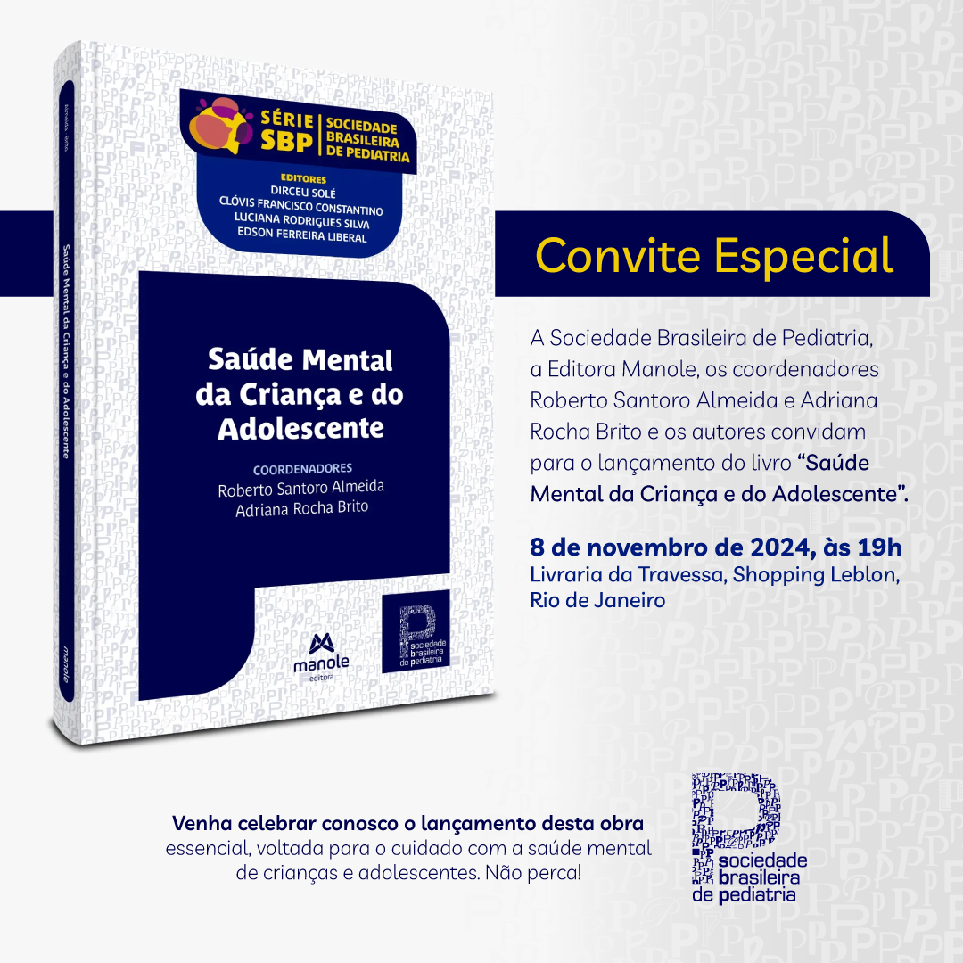 Na próxima sexta-feira, 8 de novembro, às 19h, será lançado o livro “Saúde Mental da Criança e do Adolescente – 1ª edição” na Livraria da Travessa, no Shopping Leblon, Rio de Janeiro. A obra, de autoria dos drs. Roberto Santoro Almeida e Adriana Rocha Brito, coordenadores do Grupo de Trabalho de Saúde Mental da Sociedade Brasileira de Pediatria (SBP), faz parte da “Série SBP”, iniciativa que oferece orientações práticas para áreas específicas da pediatria.