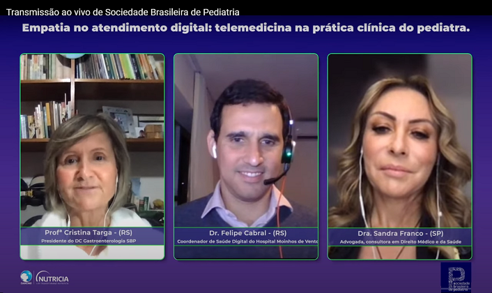 Com mais de mil visualizações até o momento, a live “Empatia no atendimento digital: Telemedicina na prática clínica do pediatra” trouxe os aspectos mais atuais acerca do teleatendimento nesse período de pandemia da Covid-19. Transmitida no último dia 26 pelas páginas da Sociedade Brasileira de Pediatria (SBP) no Facebook e YouTube, em parceria com a Danone Nutricia, a live contou com a moderação da dra. Cristina Targa, presidente do Departamento Científico de Gastroenterologia, e com a participação dos drs. Felipe Cabral, coordenador de Saúde Digital do Hospital Moinhos de Vento, e Sandra Franco, advogada consultora em Direito Médico e da Saúde.
