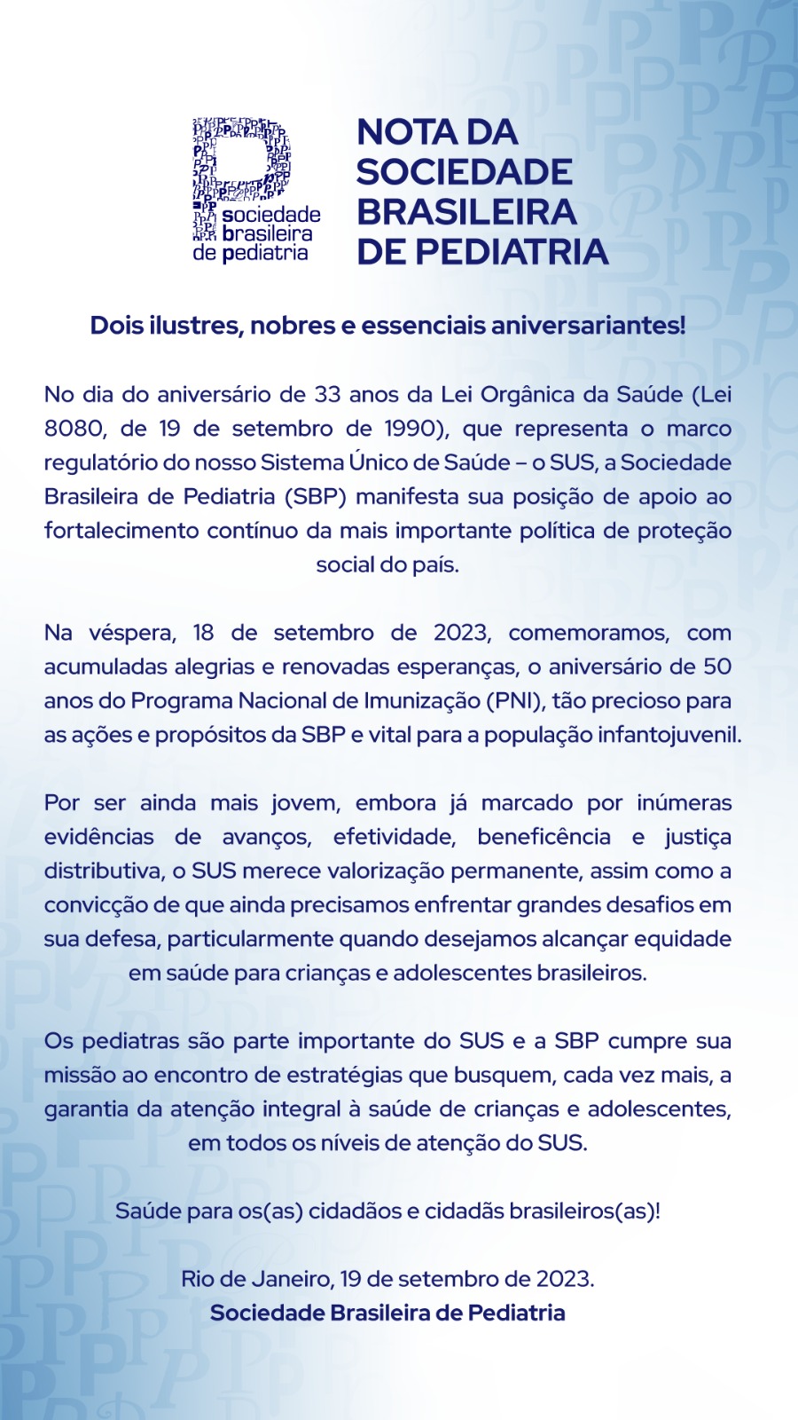 MENSAGEM DA SBP EM ALUSÃO AOS ANIVERSÁRIOS DO SUS E DO PNI