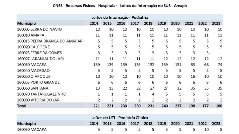 Diante do crescimento exponencial dos casos de síndromes gripais e respiratórias registrados no Amapá entre crianças e adolescentes, as Sociedades Brasileira (SBP) e Amapaense de Pediatria (SAP) vem a público demonstrar sua preocupação, sobretudo em função da insuficiência de leitos pediátricos atualmente disponíveis na rede pública de saúde do Estado. Dados do Ministério da Saúde analisados pelas entidades mostram que, nos últimos cinco anos, a capital amapaense perdeu quase 50% dos leitos de internação pediátricos. Em 2019, eram 139 vagas disponíveis. Hoje, são apenas 74 leitos destinados às crianças em Macapá.