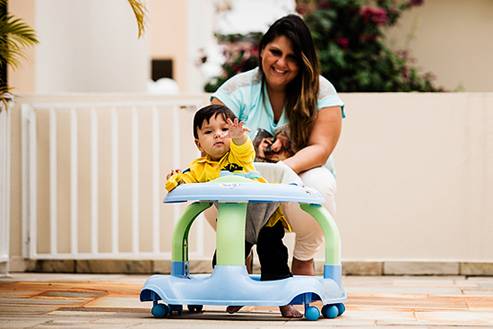 Juliana e seu filho Matheus, de 11 meses, com o andador
