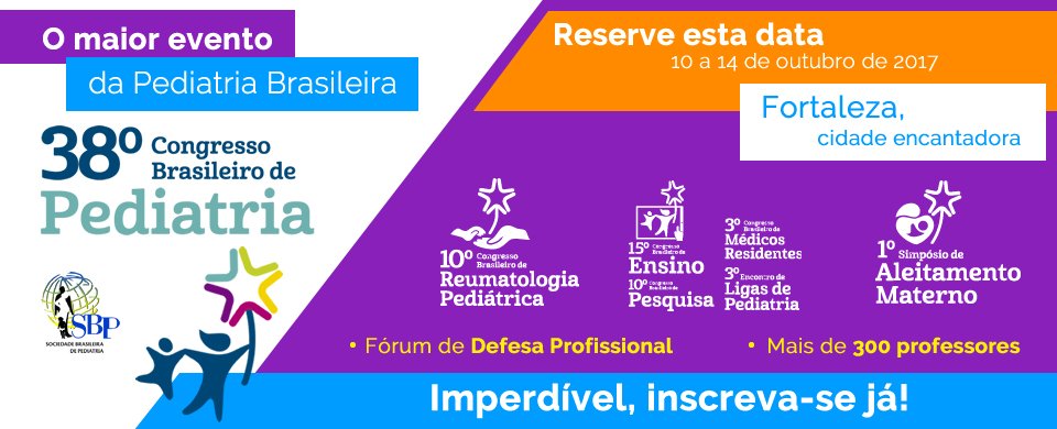 PROGRAMAÇÃO – No site do 38º CBP, que acontecerá de 10 a 14 de outubro, em Fortaleza (CE), é possível saber mais detalhes sobre o encontro que promete ser um marco para a especialidade. O tema central será “Eu pediatra, cuidando do futuro do Brasil”. Conferencistas de renome nacional e internacional farão parte da programação que contemplará temas do cotidiano, do avanço do conhecimento, das atualizações pertinentes à prática médica e da luta pela valorização do pediatra.