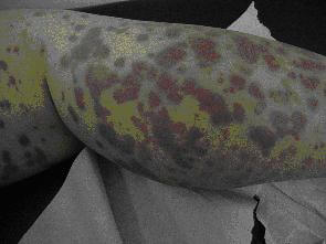 Figura 1 – Lesões púrpuricas palpáveis em perna e coxa direita em uma paciente com púrpura de Henoch-Schönlein