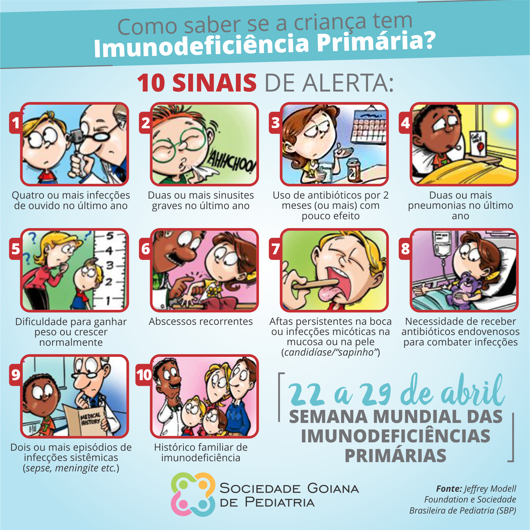 Com o apoio da Sociedade Goiana de Pediatria (SGP), a ação visa alertar os responsáveis por crianças para a atenção aos sinais e sintomas dessas doenças, visto que quando não tratadas precocemente, podem gerar consequências graves e até mesmo a morte. Entre os principais sinais estão a maior predisposição a infecções (de ouvido, na pele, sinusites e pneumonias) e a dificuldade para ganhar peso ou crescer normalmente. Entretanto, em algumas crianças a doença pode se manifestar com uma primeira infecção muito grave ou causada por um germe que, comumente, não tem efeito em pessoas saudáveis, além dos casos em que os problemas são autoimunes ou gastrointestinais (digestivos).