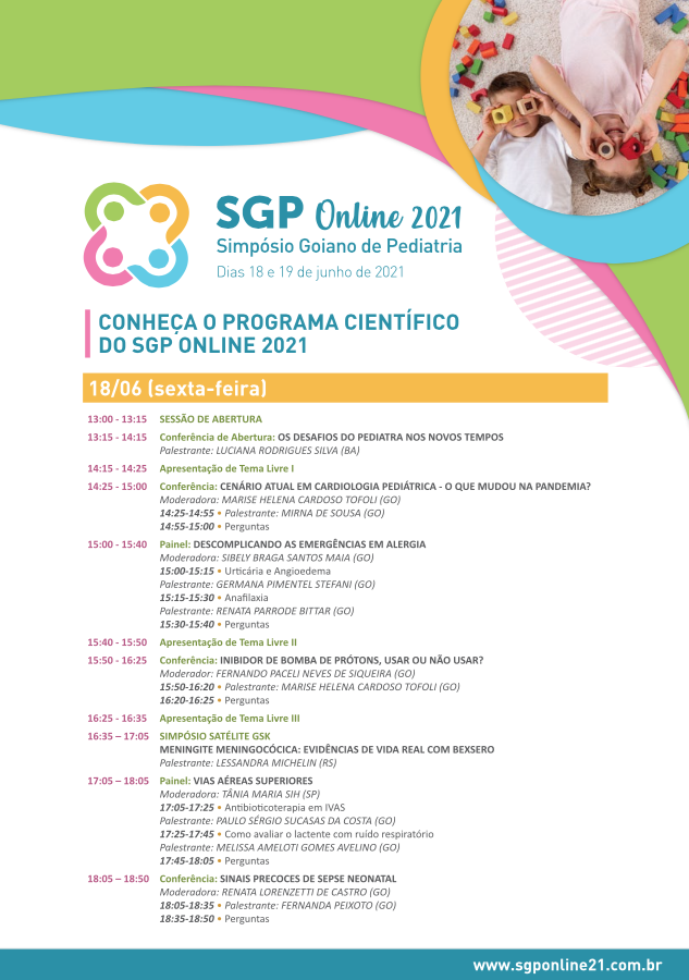 Em tempos de pandemia, a SGP busca alternativas para levar conhecimento e atualização científica à comunidade pediátrica de forma on-line. Para isto, a Sociedade promove entre os dias 18 e 19 de junho, o Simpósio Goiano de Pediatria (SGP Online 2021), um evento virtual repleto de informações científicas atuais no que diz respeito ao diagnóstico, tratamento e prevenção de doenças, entre outros cuidados para um desenvolvimento saudável e plenos das nossas crianças e adolescentes.