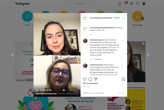 A Sociedade Goiana de Pediatria (SGP) promoveu uma live aberta ao público para debater o tema “COVID-19 e o os desafios da volta às aulas”. A apresentação virtual, transmitida por meio do Instagram, na última segunda-feira (22), teve como intuito auxiliar pais e pediatras, fornecendo orientações a respeito das medidas mais adequadas para garantir a segurança física e mental de crianças e adolescentes, diante da possibilidade de retorno das atividades escolares.