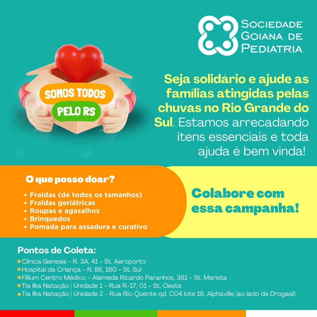 A SGP (Sociedade Goiana de Pediatria) começa nesta terça-feira (14) uma campanha de arrecadação para apoiar as vítimas das tragédias ocorridas no Rio Grande do Sul. Com o intuito de oferecer suporte a todos os afetados, a iniciativa destaca a importância de pensar especialmente nas crianças, que muitas vezes são as mais vulneráveis em situações de crise. Por isso, o objetivo é arrecadar fraldas de todos os tamanhos, roupas e agasalhos infantis, brinquedos, além de itens de higiene, pomadas para assaduras e materiais de primeiros socorros.