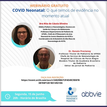 A Sociedade Paraense de Pediatria (SOPAPE) promoverá, na próxima segunda-feira (15), às 20h o webinar “COVID Neonatal: o que temos de evidência no momento atual”. A atividade, que terá duração de uma hora e meia, é gratuita e feita em parceria com a Abbvie.