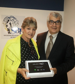 A pediatra Rosa Maria Reis Sacilotto recebeu o 2º tablet da quinta série do sorteio que vem sendo realizado pela SBP entre os associados. O presente foi entregue pelo presidente, Eduardo Vaz, na sede da Fundação Sociedade Brasileira de Pediatria, em São Paulo, no final de maio.