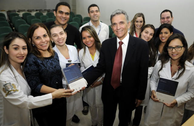 Drs. Silvana Fahel da Fonseca e Dioclécio Campos Jr. com residentes da UnB e o livro “Currículo Pediátrico Global (SBP e Manole)”. (foto: Bruno Peres)