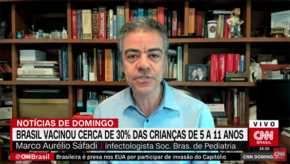O Brasil alcançou a marca de 30% das crianças de 5 a 11 anos vacinadas com a primeira dose contra à Covid-19. Em entrevista à CNN, o infectologista da Sociedade Brasileira de Pediatria (SBP), dr. Marco Aurélio Sáfadi, afirmou que a vacinação nas escolas pode ser um mecanismo importante para alavancar a campanha.