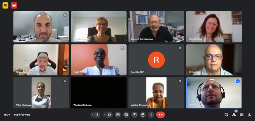 A coordenação da reunião foi feita pela dra. Maria Angélica Barcellos Svaiter (1ª diretora financeira da SBP) com o apoio dra. Mónica Oliva (Portugal). Estiveram presentes no encontro virtual os drs. Sidnei Ferreira (diretor financeiro da SBP), Marcela Damásio (coordenadora do GT), Dirceu Solé (diretor científico da SBP), dra. Carla Wale (Moçambique), Zuleica Fernandes (Cabo Verde), Waldina Barbeiro (Guiné-Bissau) e Nilza Mussagy (Moçambique).